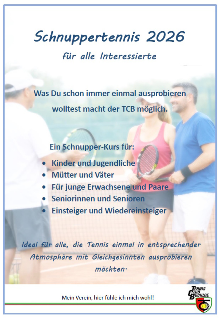 Der TC Buchloe startet auch 2026 wieder mit energiegeladenen Schnupperkursen für alle Altersklassen. Ob du lieber im intensiven Einzeltraining Gas gibst oder in einer dynamischen Kleingruppe mit maximal vier Teilnehmern einsteigst – du bestimmst das Tempo. Unser lizenzierter Trainer bringt dich (und gerne auch deine Familie) mit kraftvollen Grundschlägen, schnellen Erfolgen und jeder Menge Spielfreude auf den Platz. Perfekt, um herauszufinden, wie viel Power in dir steckt. Wir freuen uns darauf, dich bald auf dem Court zu sehe * Flyer und Anmeldeformulare findest Du neben dem Eingang unseres Klubhauses | ![]() |